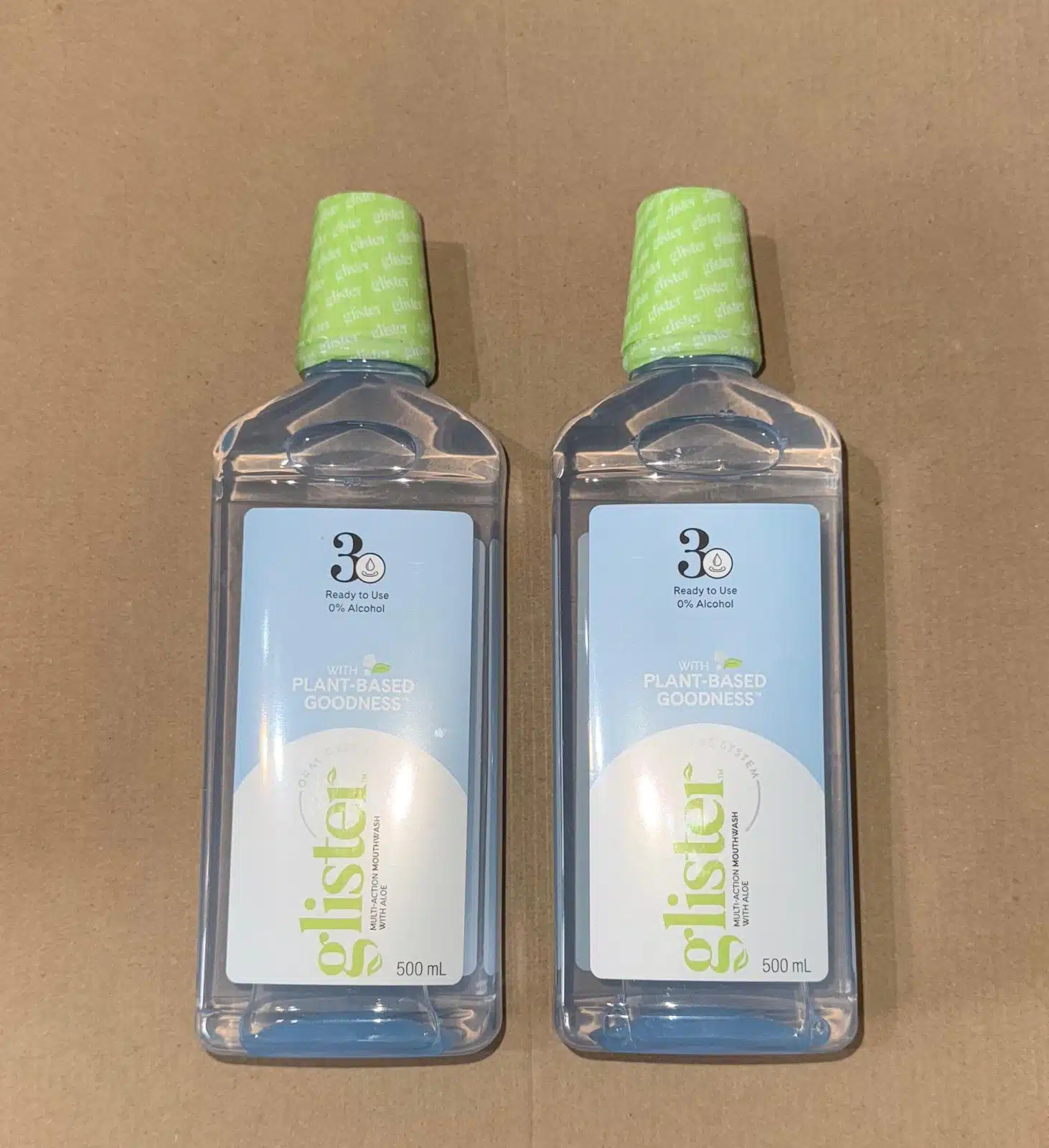 2 bottles of Glister Multi-Action Mouthwash with Aloe. Alcohol-free formula for long-lasting freshness and cleaner feeling mouth. 500ml per bottle.