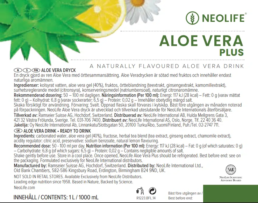 Great value 2-pack of NeoLife Aloe Vera Plus 1L. A naturally flavoured aloe vera drink made with premium inner-leaf aloe vera gel, blended with herbal tea extracts and natural lemon flavouring. Refreshing taste, ready to drink, UK Seller