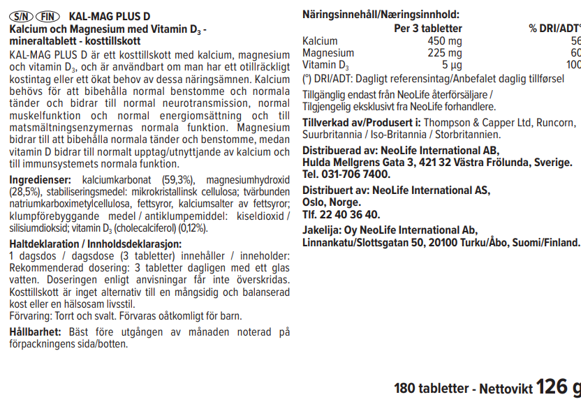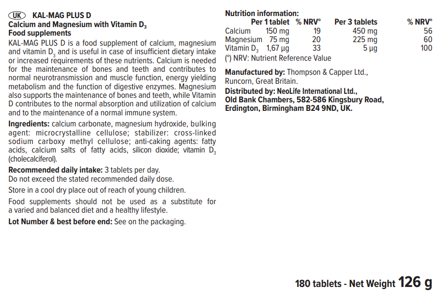 NeoLife Kal-Mag Plus D is a high-quality mineral supplement combining three essential nutrients: calcium, magnesium and vitamin D. Each bottle contains 180 tablets, offering excellent value for daily use. This formula is designed to support general nutritional needs and help maintain balanced intake of important minerals as part of a normal diet.