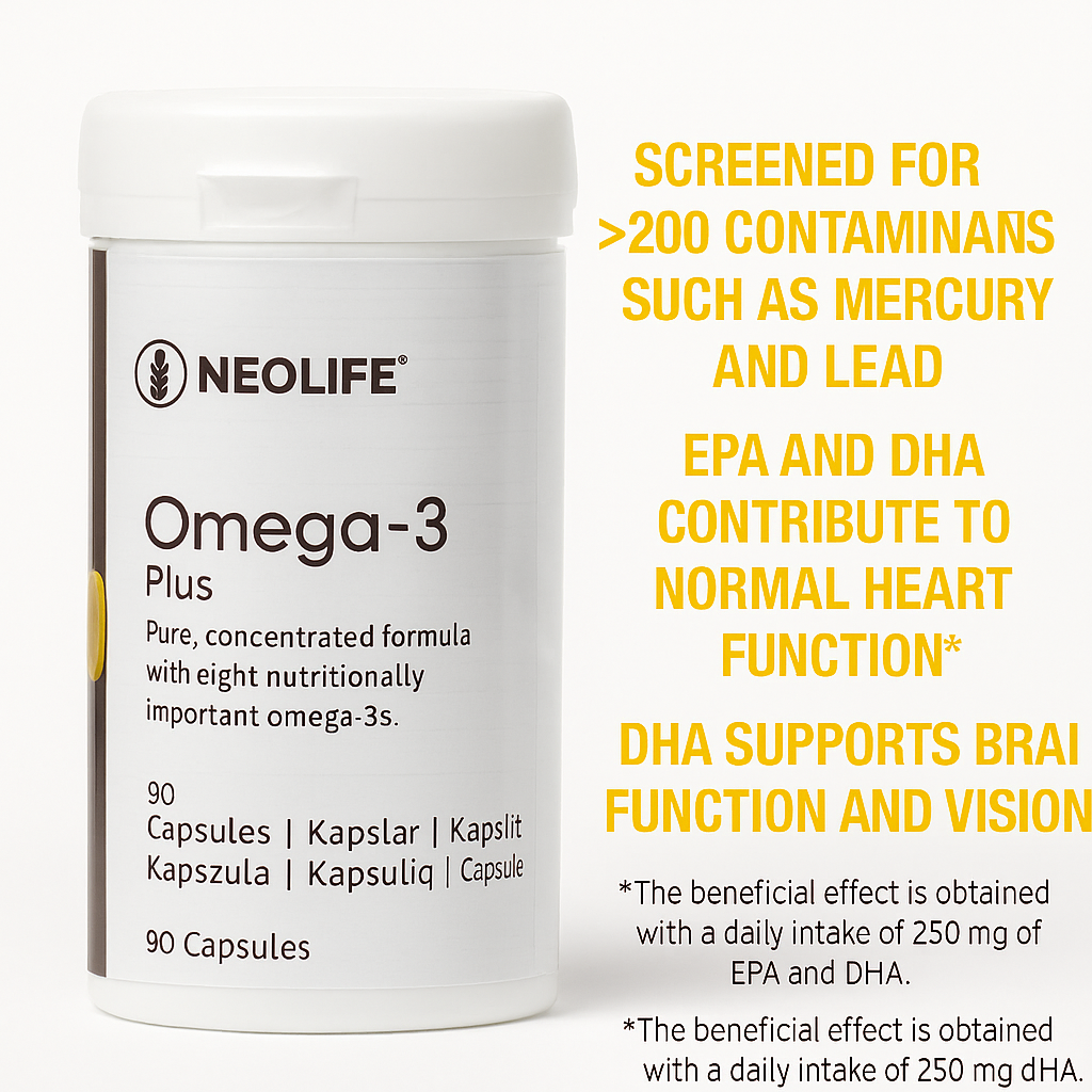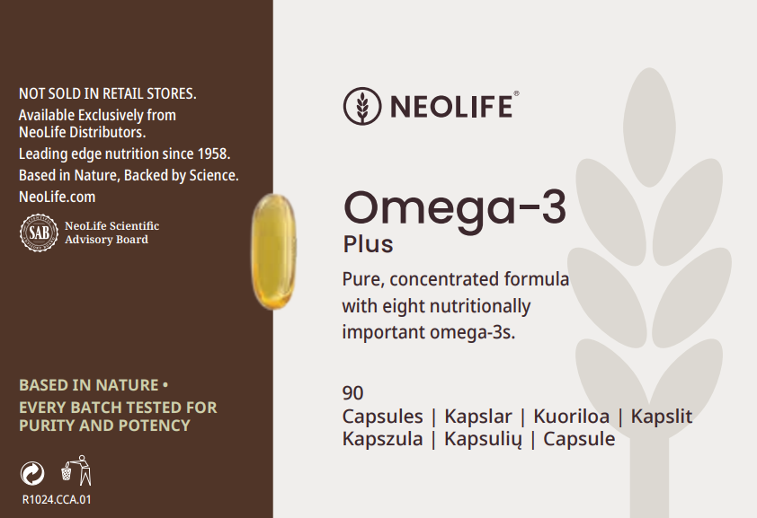 NeoLife Omega-3 Plus provides a high-quality, concentrated omega-3 fish oil formula. Each bottle contains 90 capsules, made using fish oil that has been screened for over 200 potential contaminants to ensure purity and quality. The formula includes a balanced profile of omega-3 fatty acids such as EPA and DHA, naturally occurring in human nutrition.