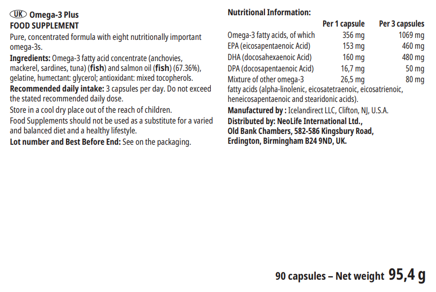 NeoLife Omega-3 Plus – 90 Capsules Pure Concentrated Omega-3 Formula – UK Seller